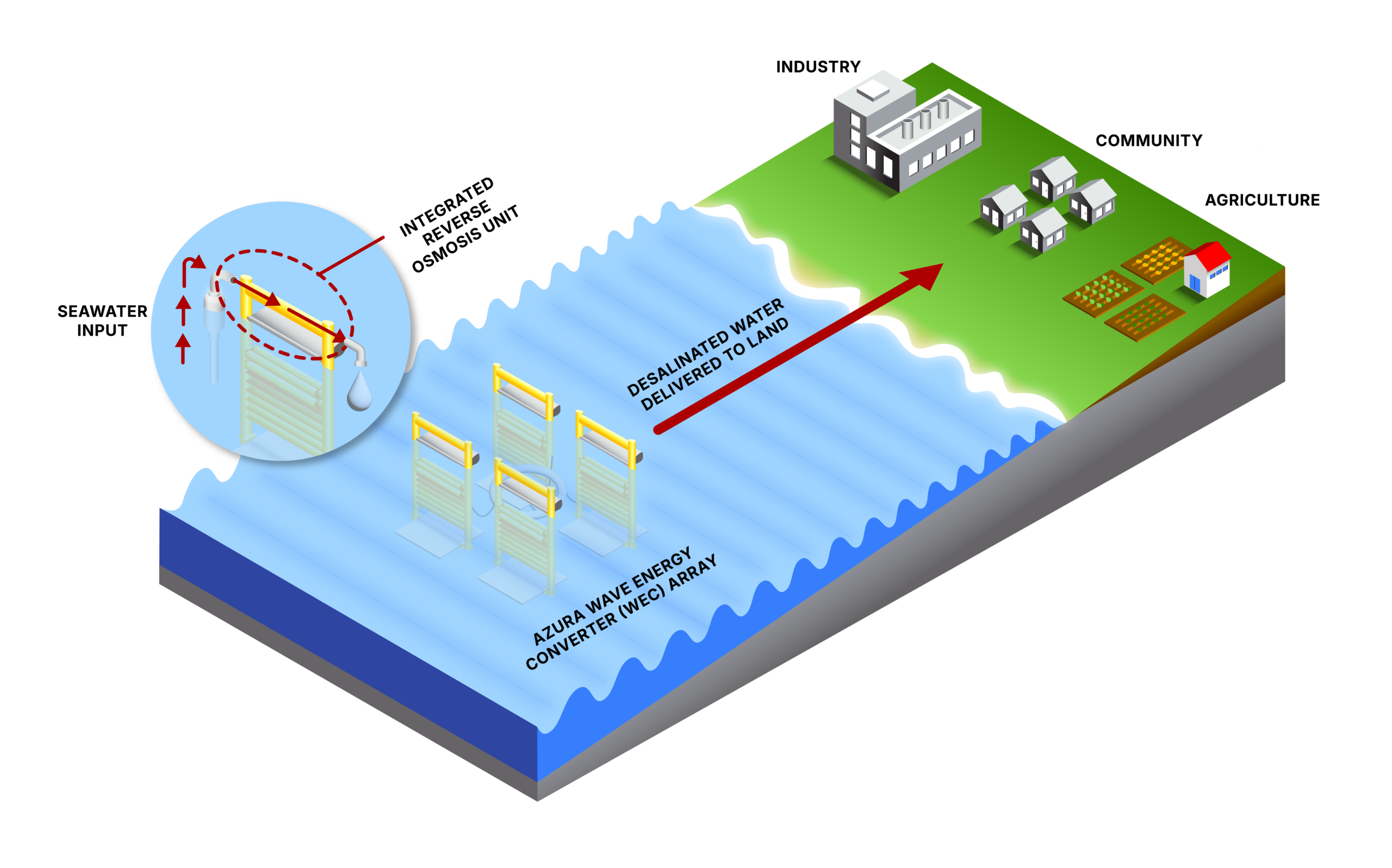 The Azura system combines wave energy conversion technology with a commercial reverse osmosis desalination unit. The Azura wave device captures the kinetic energy from waves and converts it directly into electrical power to drive the desalination process.