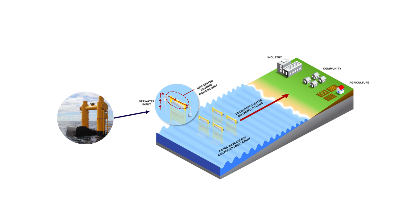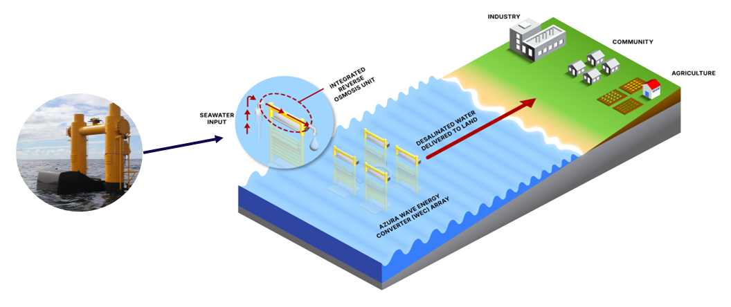 Azura’s proven wave energy converter (WEC) can produce fresh water at sea (“at-sea desalination”) by integrating a commercial Reverse Osmosis (RO) unit into the the power generator.